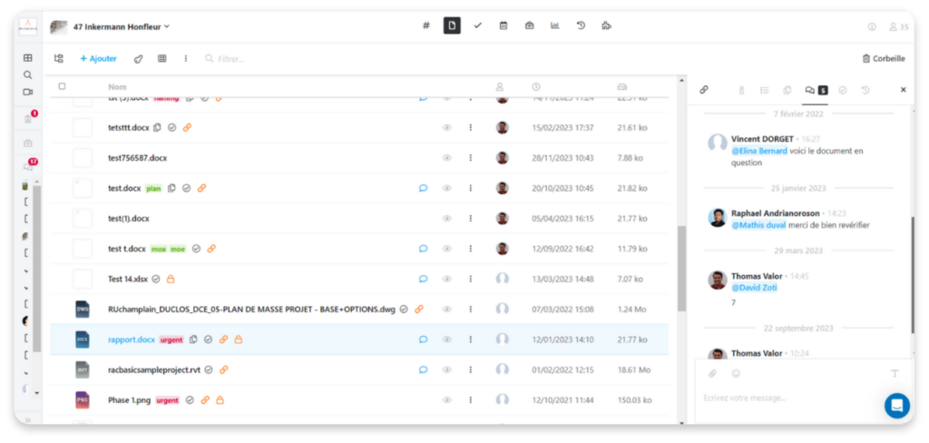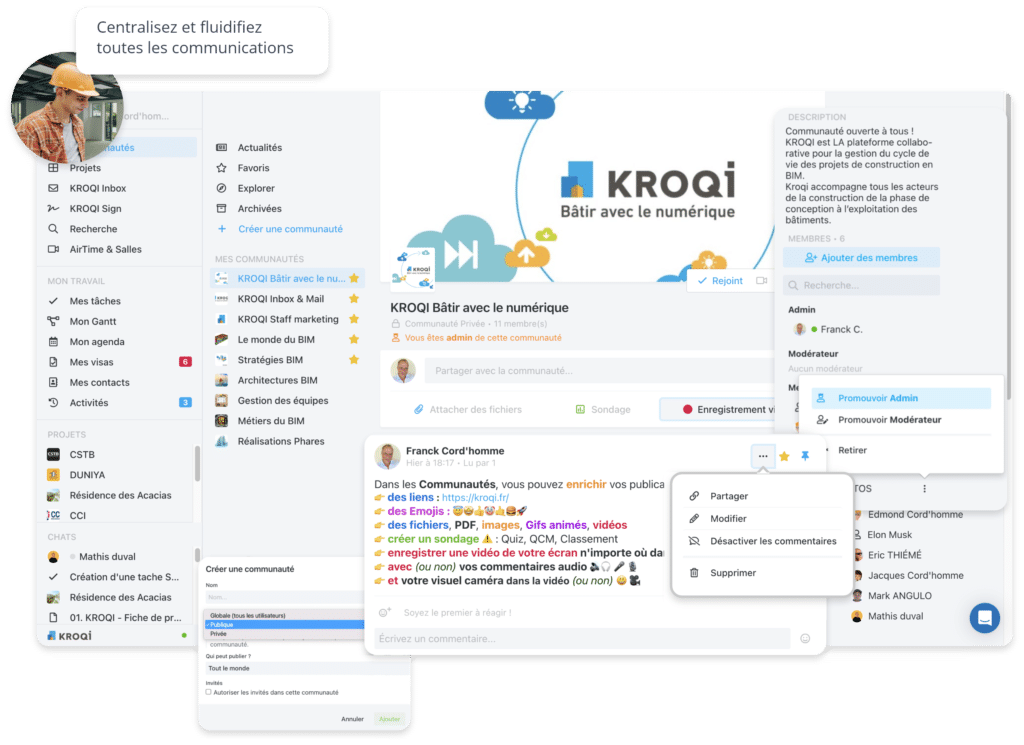 La communication fait partie intégrante du logiciel BIM Kroqi. Un chat projet permet des échanges rapides entre les équipes, tandis que les commentaires peuvent être ajoutés directement sur les documents ou les objets BIM. L’ensemble des actions est regroupé dans un fil d’activité complet, offrant une vision claire de l’avancement du projet.