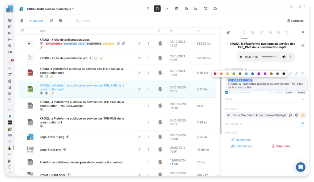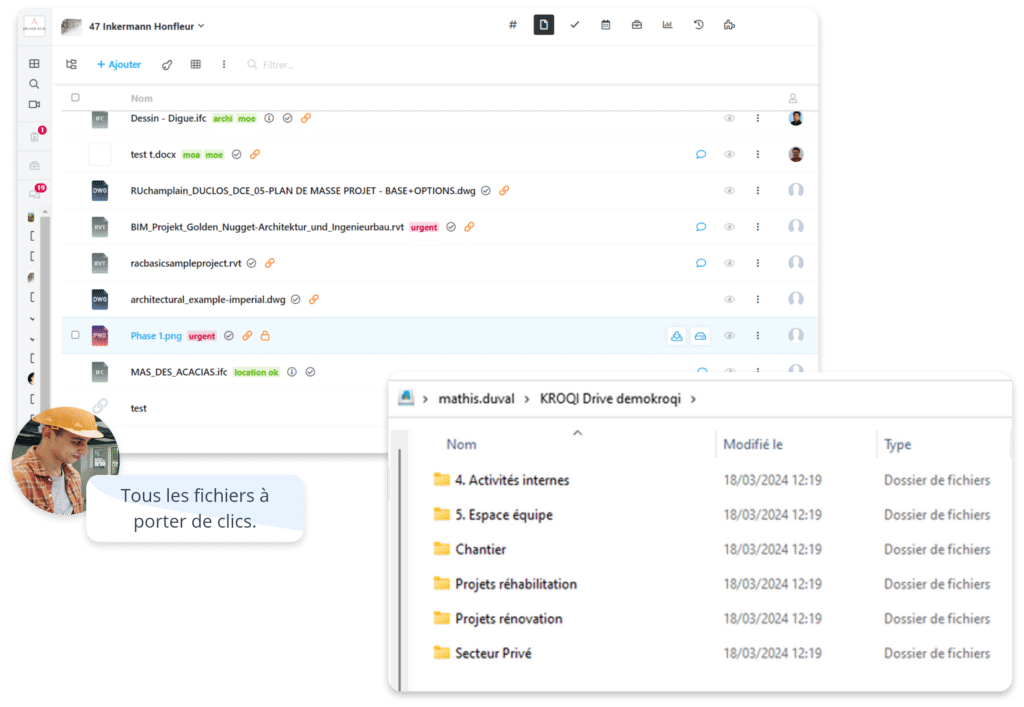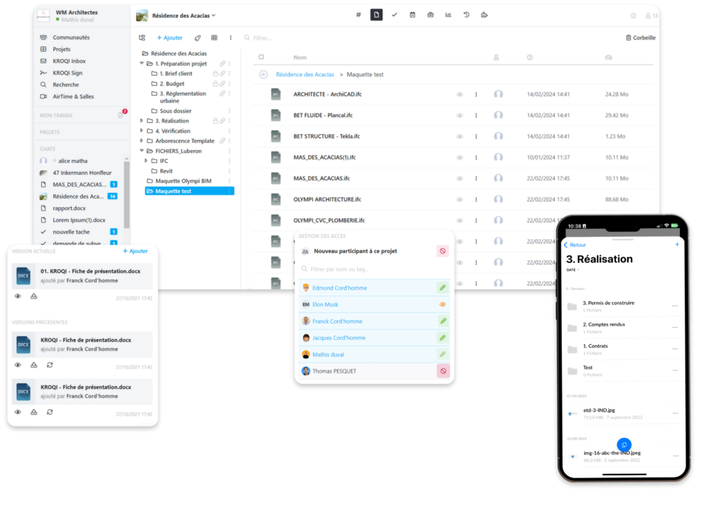 La fiabilité des données est un enjeu majeur des projets BIM. Kroqi assure l’archivage sécurisé des documents, avec un historique détaillé des modifications et des versions. Les dépôts massifs de fichiers sont simplifiés grâce au drag & drop et à l’intégration avec des outils de type Drive.