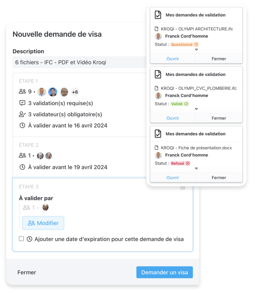 Un logiciel BIM performant doit également automatiser les processus. Kroqi propose des workflows paramétrables pour les circuits de validation, les visas et les livrables. Les notifications automatiques sont ciblées selon les rôles, ce qui évite les relances manuelles et les oublis.